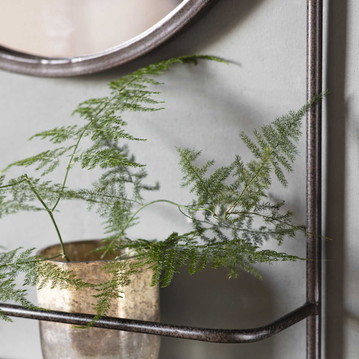 Зеркало с полочкой. Металлическое основание выполнено в отделке бронза. Высота 630 мм, ширина 420 мм, глубина 110 мм.