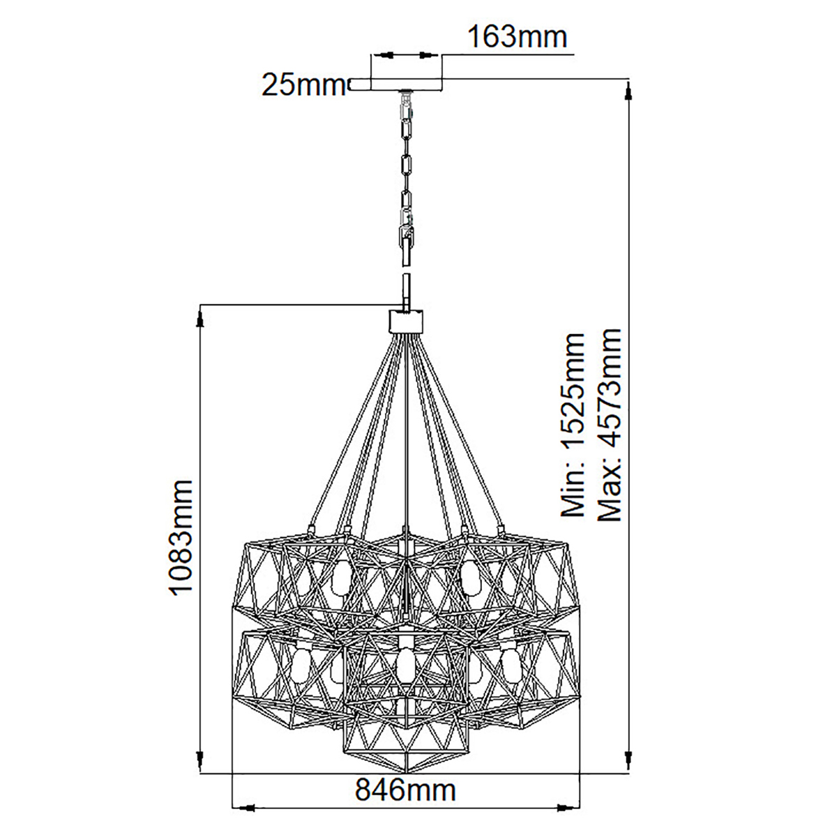 Люстра Elstead Lighting HK-ASTRID-11P. Ровный и изящный, светильник в виде геометрической фигуры кажется хрупким и воздушным, но одновременно это прочная сварная конструкция. Внутри видны источники света, закрепленные в нижней части. Они как будто парят внутри металлической конструкции. Двухцветная отделка дополнительно усиливает эффект наслаивания для создания дополнительной глубины и объема. Идеально подойдет для освещения гостинной, кухни, спальни, столовой. Поставляется с цепью длиной 3048 мм